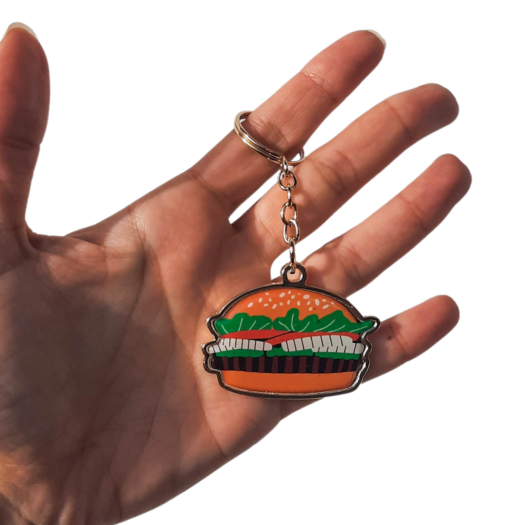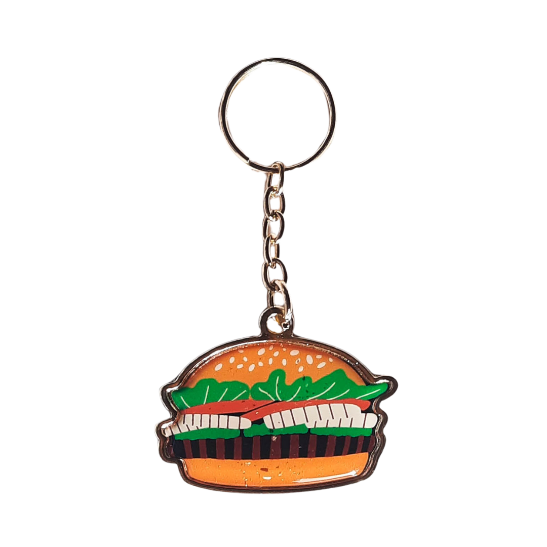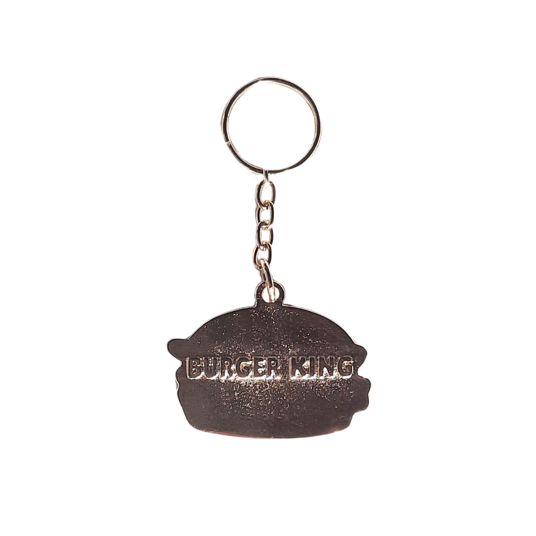 Llavero metálico con forma personalizada, frente protegido por un dome transparente y brillante. Puede incluir inscripción en relieve en la parte trasera.